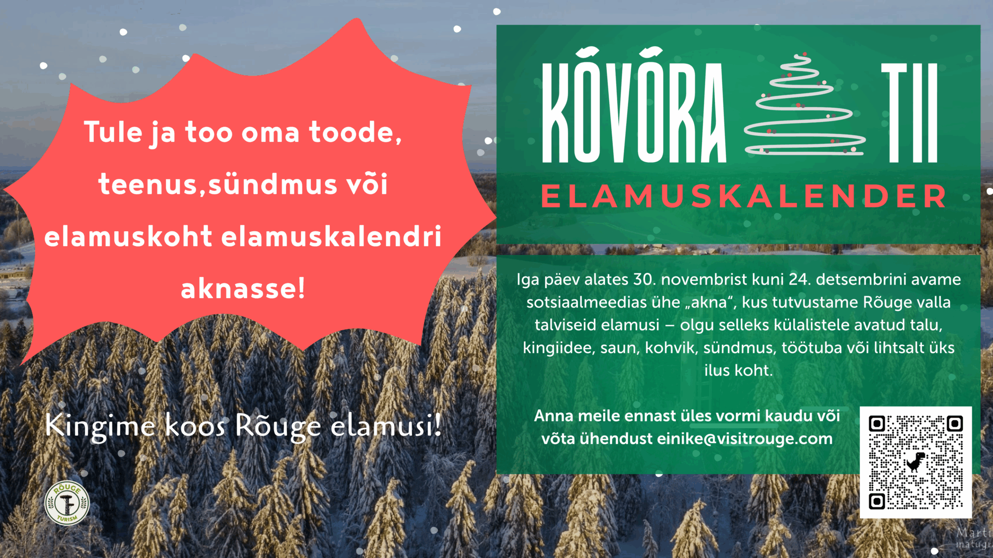 „Kõvõra tii elamuskalender“ sündis mitu aastat tagasi soovist tuua esile Rõuge valla talvised võimalused – meie inimesed, ettevõtted, tooted ja paigad, mis pakuvad elamusi ka külmal ajal.