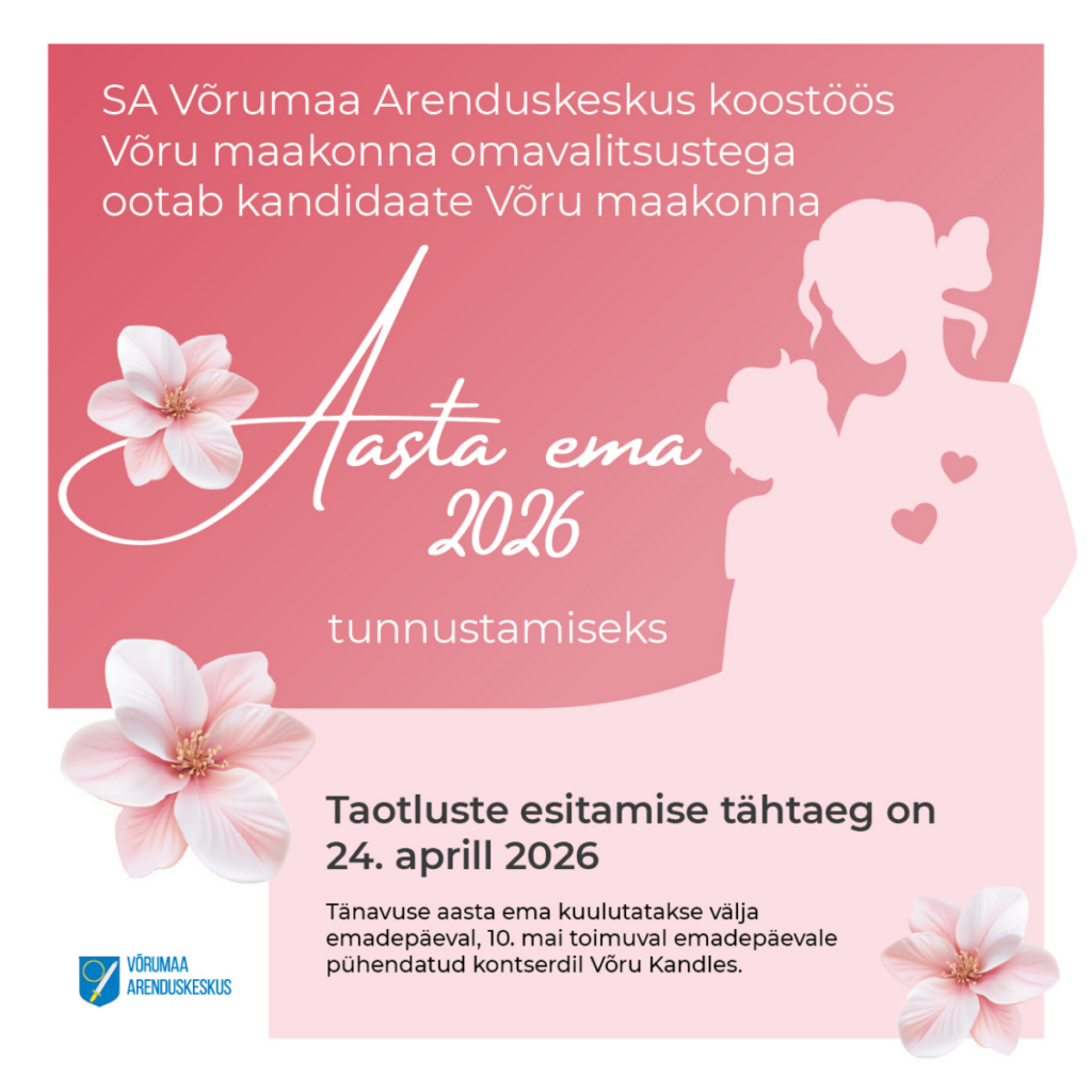 SA Võrumaa Arenduskeskus koostöös Võru maakonna omavalitsustega ootab kandidaate Võru maakonna aasta ema tunnustamiseks. Taotluste esitamise tähtaeg on 24. aprill 2026.