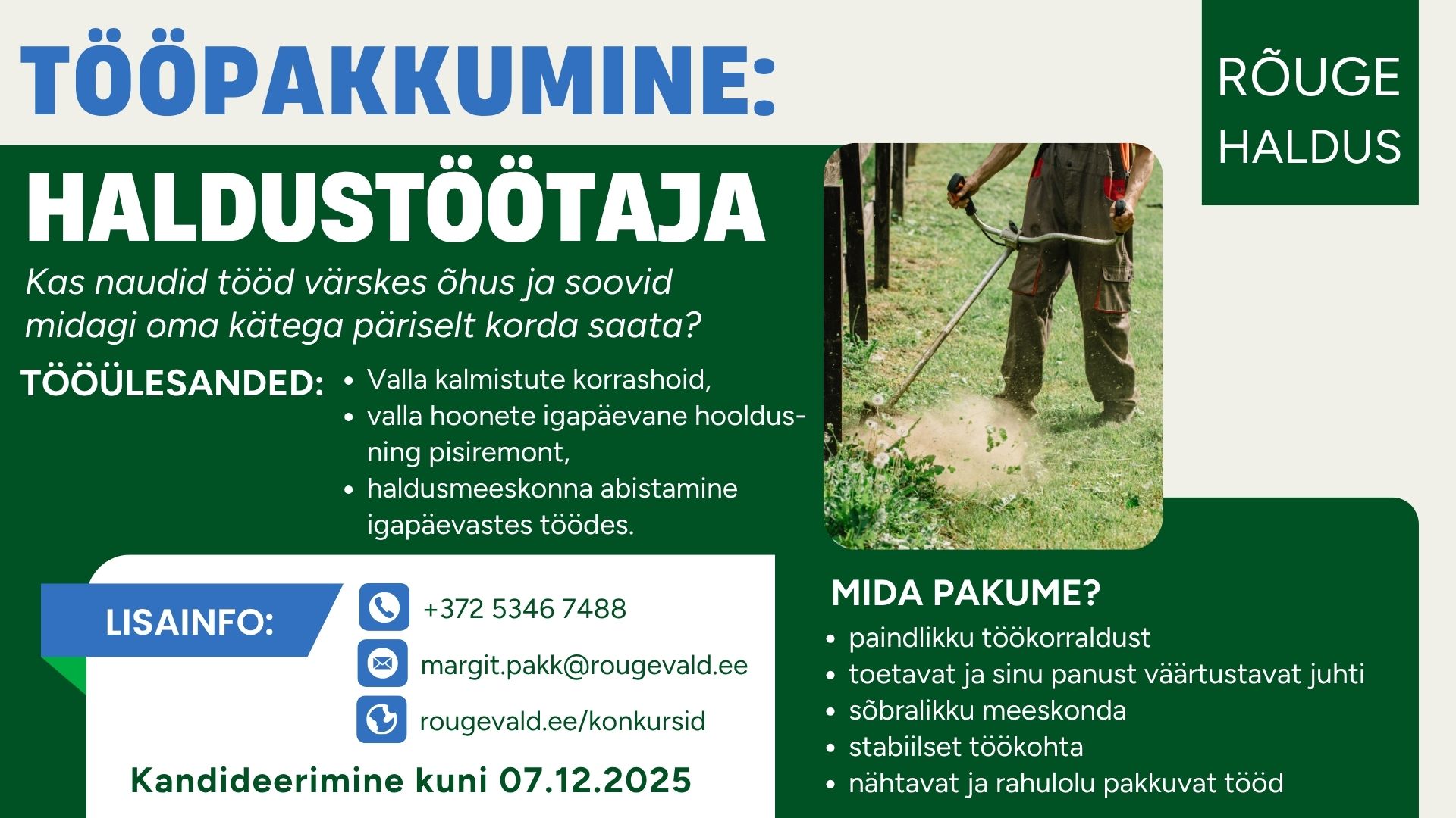 Kandideerimiseks saada CV märgusõnaga “Haldustöötaja” hiljemalt 7. detsembril 2025 e-postile vald@rougevald.ee
