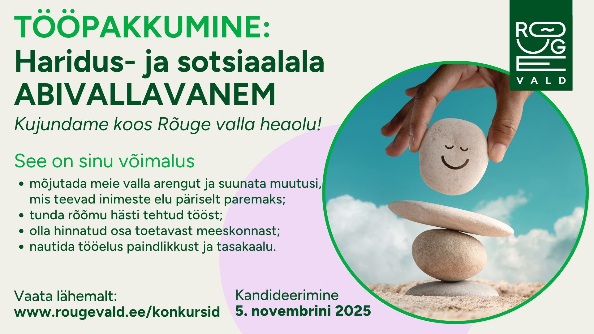 Otsime oma meeskonda haridus- ja sotsiaalala abivallavanemat, keda innustab võimalus kujundada Rõuge valla haridus- ja sotsiaalvaldkonna tulevikku ning kes näeb inimeste ja kogukonna vajadusi numbrite ja struktuuride taga.