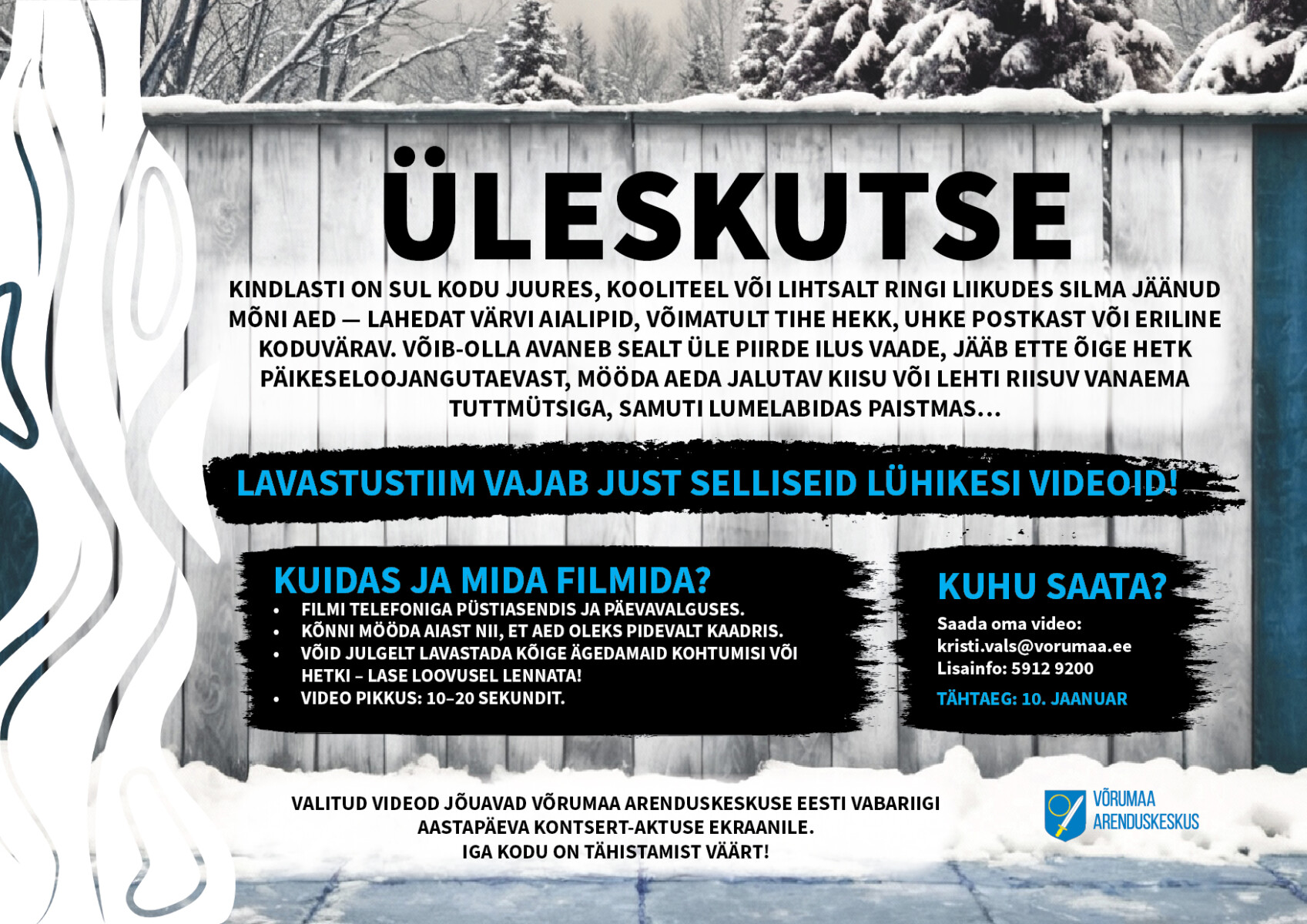 Võrumaa Arenduskeskus koostöös maakonna kohalike omavalitsustega kutsub üles kõiki huvilisi saatma videoid mõnest endale silma jäänud huvitavast koduaiast. Valitud videod jõuavad veebruaris peetava Eesti Vabariigi aastapäeva kontsert-aktuse ekraanile.